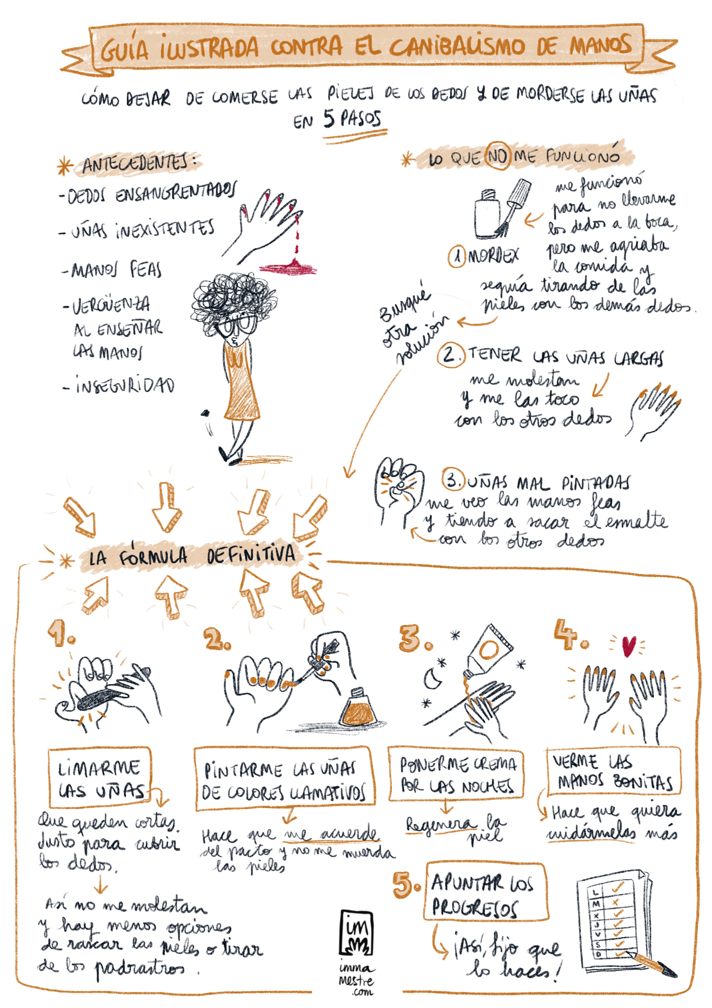 Estrés, ansiedad, un poco de aburrimiento, dedos ensangrentados, uñas inexistentes, manos feas, dedos como muñones, vergüenza para enseñar las manos e inseguridad. No son los ingredientes para una poción mortal digna de la bruja más mala. Son algunos de los antecedentes con los que vivía como consecuencia de mi canibalismo de manos. O sea, de no saber cómo dejar de comerme las uñas y las pieles de los dedos. Así tenía yo las manos de poco glamurosas.