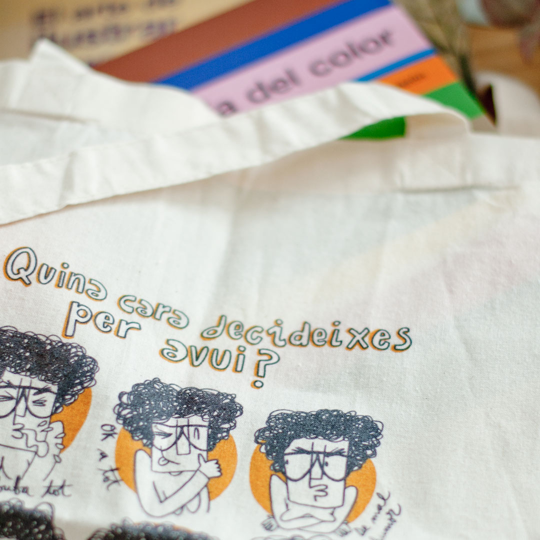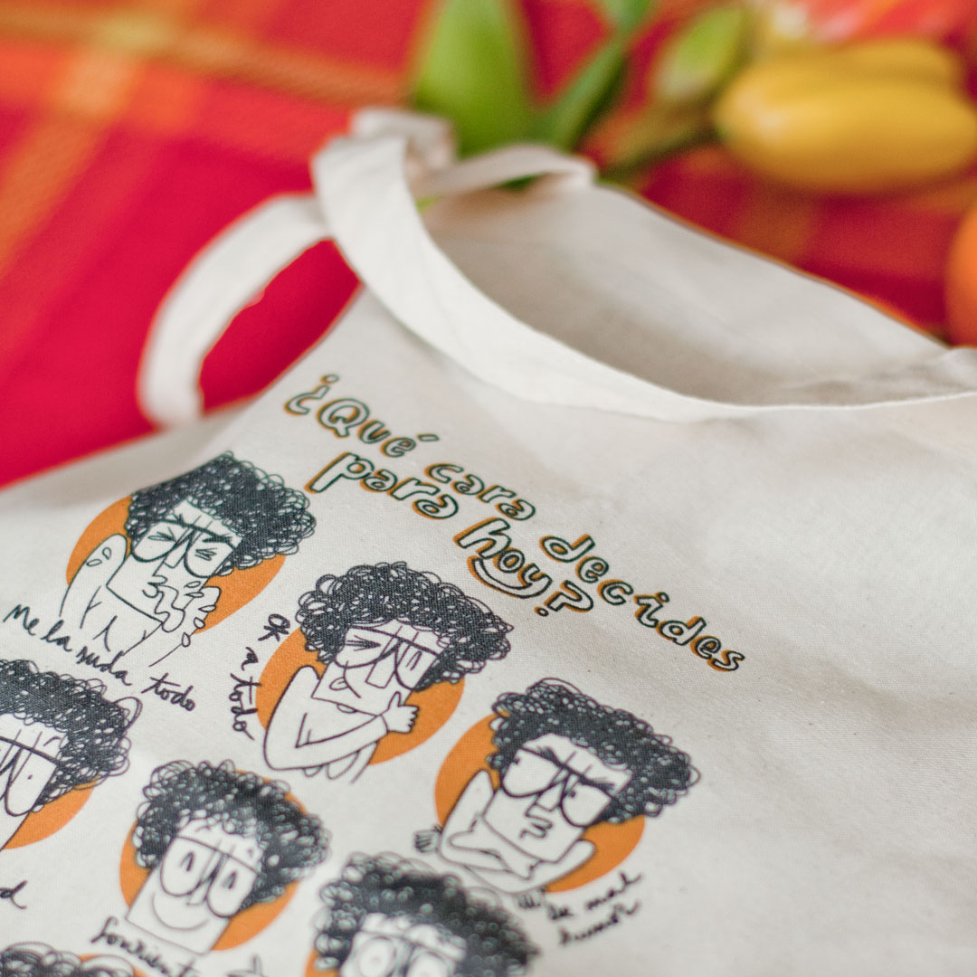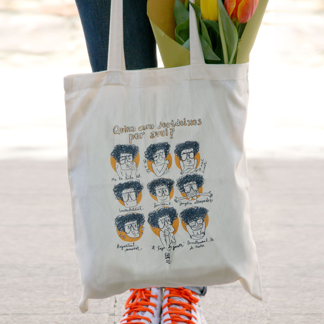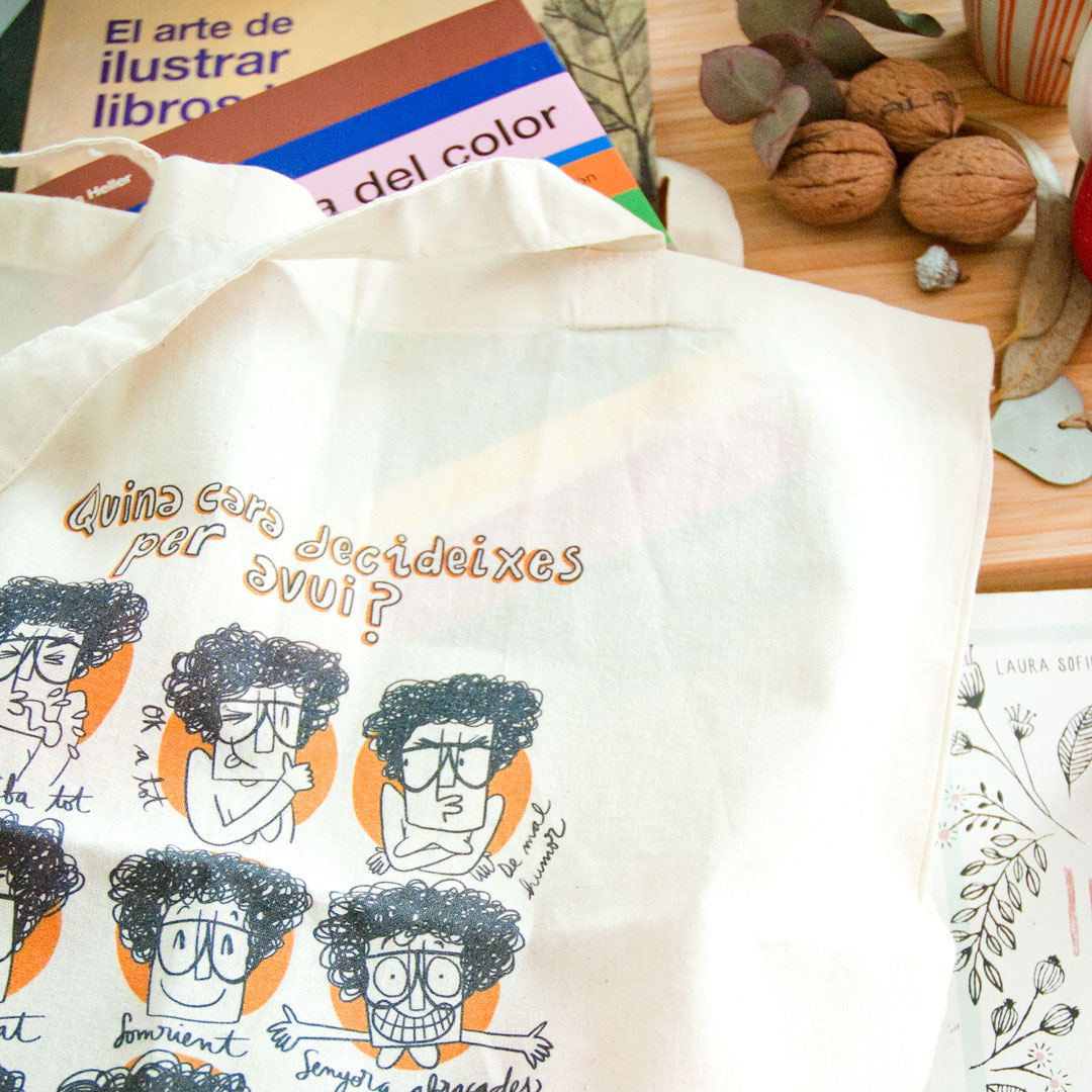 Bolsa de tela de algodón, color beige, tipo Tote Bag. Asa larga. Ilustración original de Imma Mestre