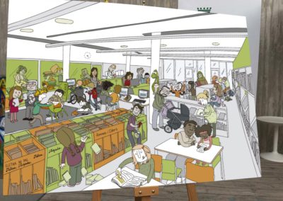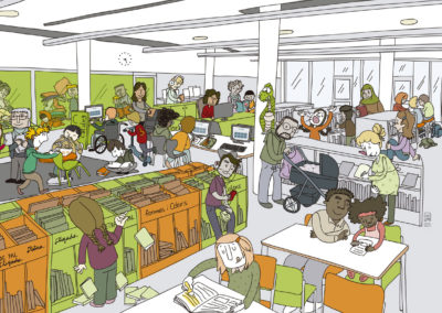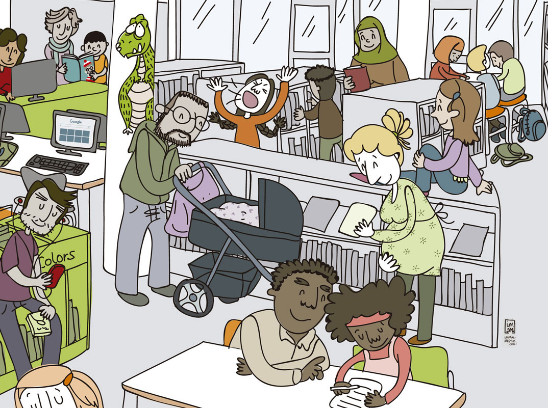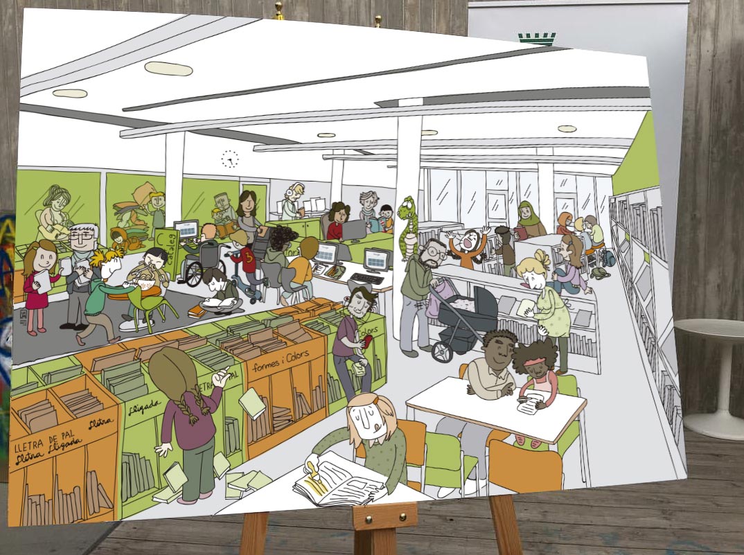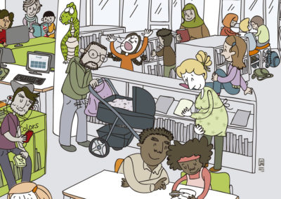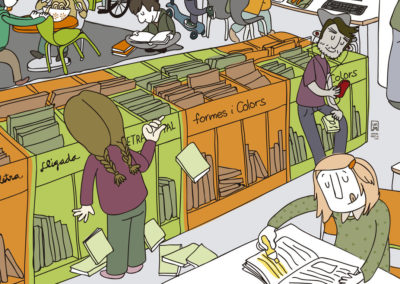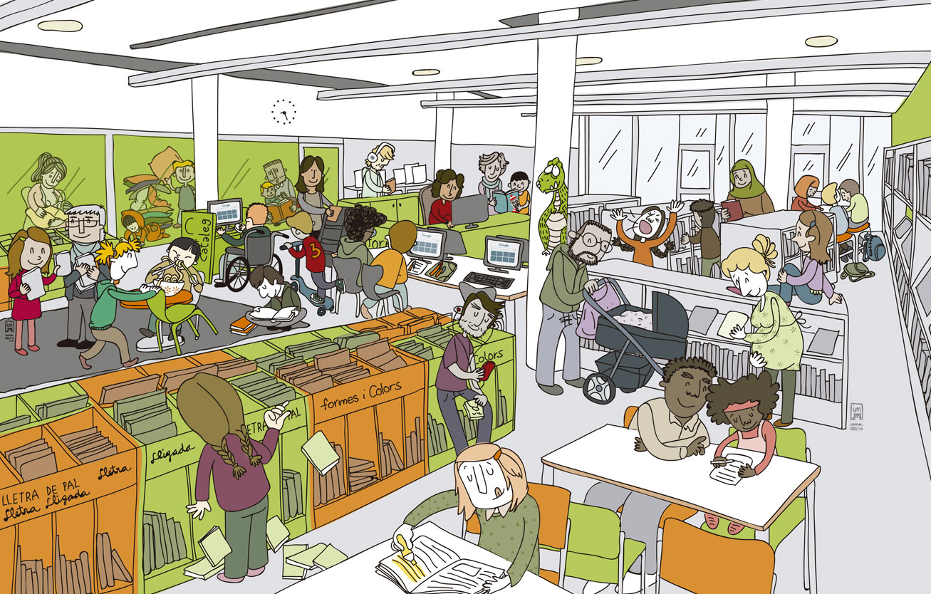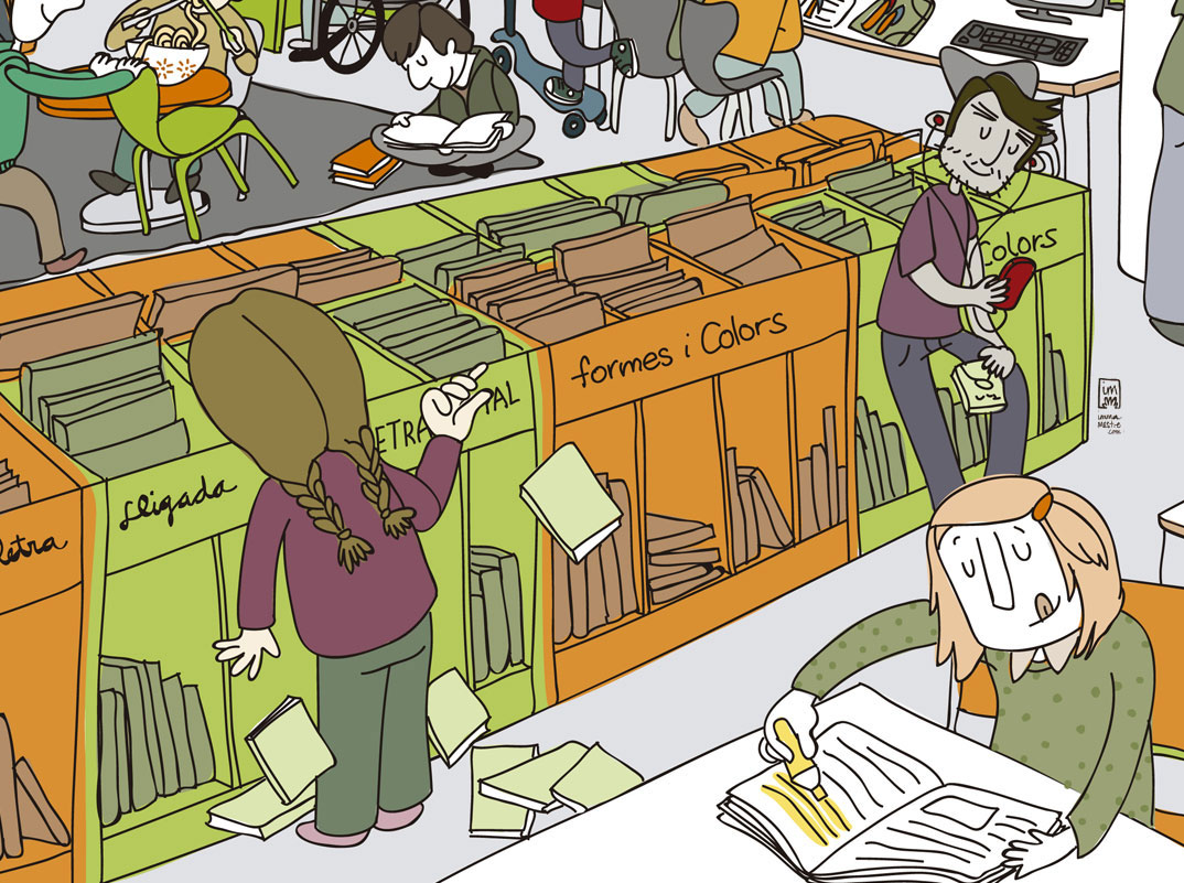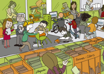 Ilustración para la Biblioteca de Esparreguera para potenciar las buenas prácticas de los usuarios en el recinto. La ilustración muestra diferentes personajes realizando varias acciones. Algunas son correctas, otras no.