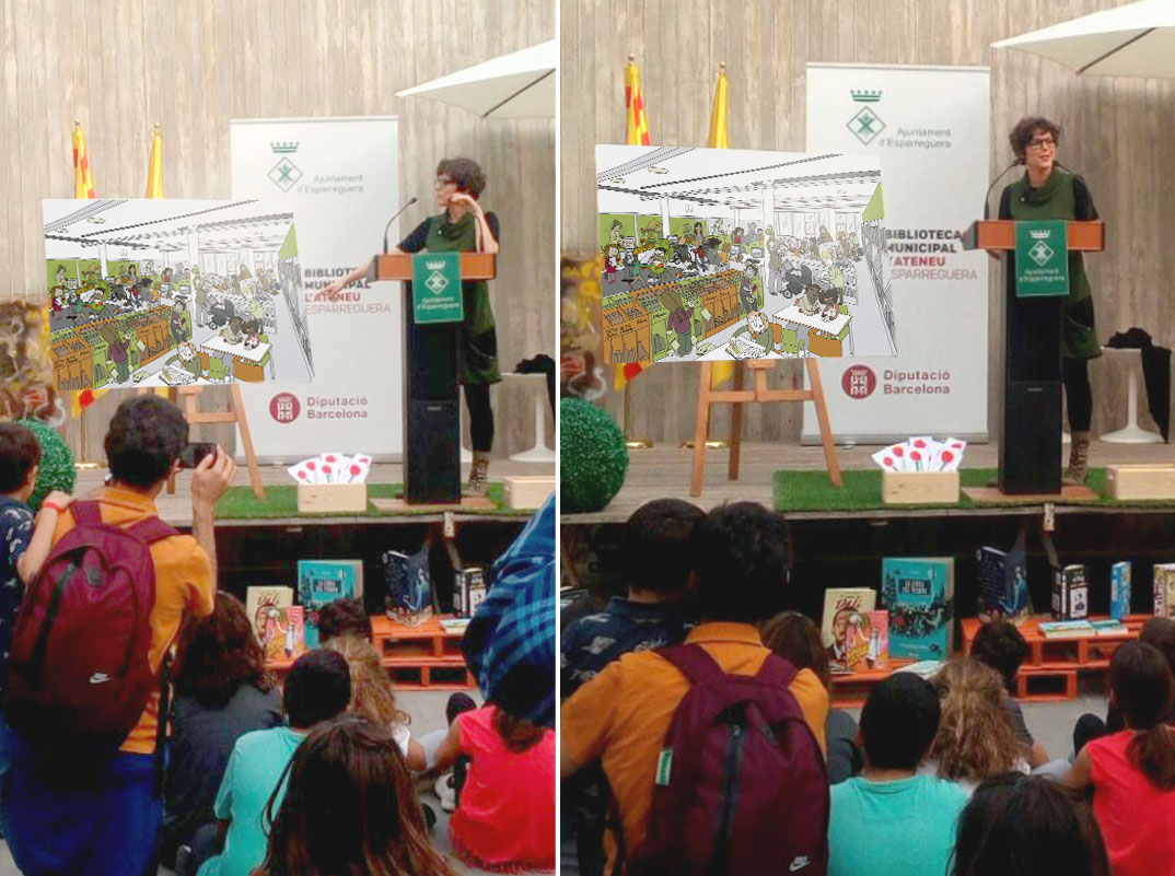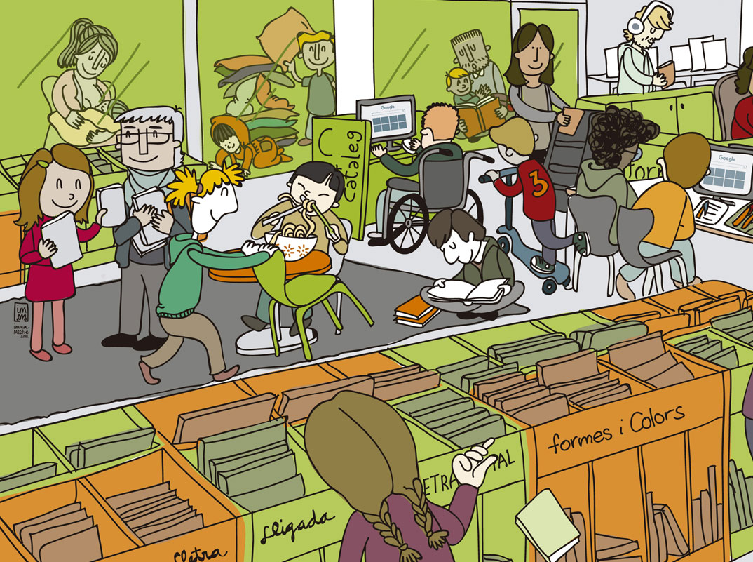 Esta ilustración decorará la pared de la biblioteca y también servirá como actividad didáctica cuando reciban visitas de otros colegios. Los niños tendrán que reconocer qué acciones pueden llevarse a cabo dentro de las bibliotecas y cuáles no.