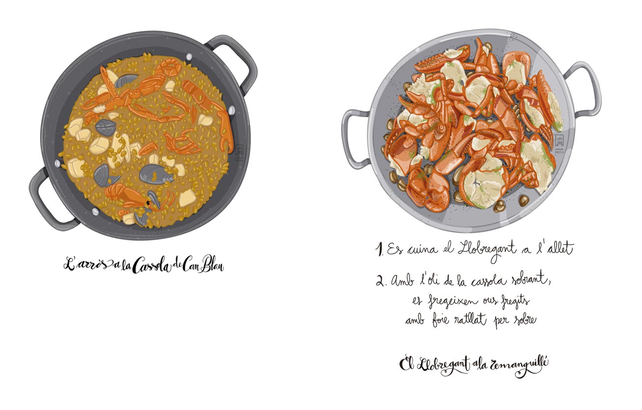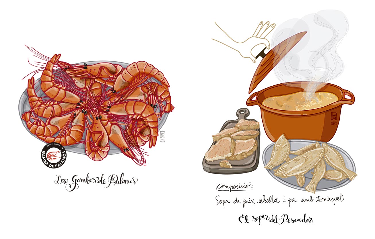 Ilustraciones y lettering de los platos estrella del restaurante Can Blau de Palamós para poner en la entrada del restaurante acompañando la carta de precios.
