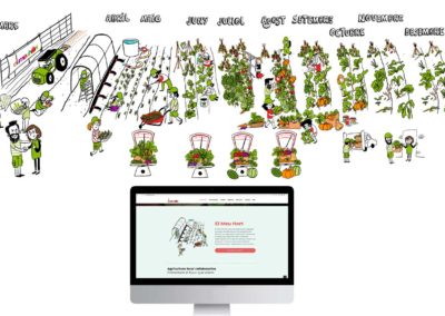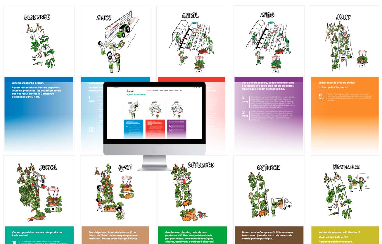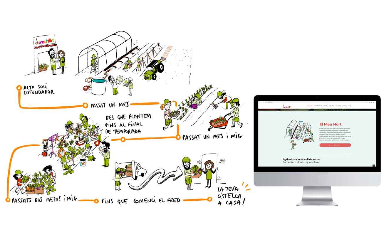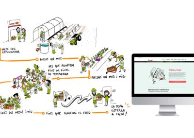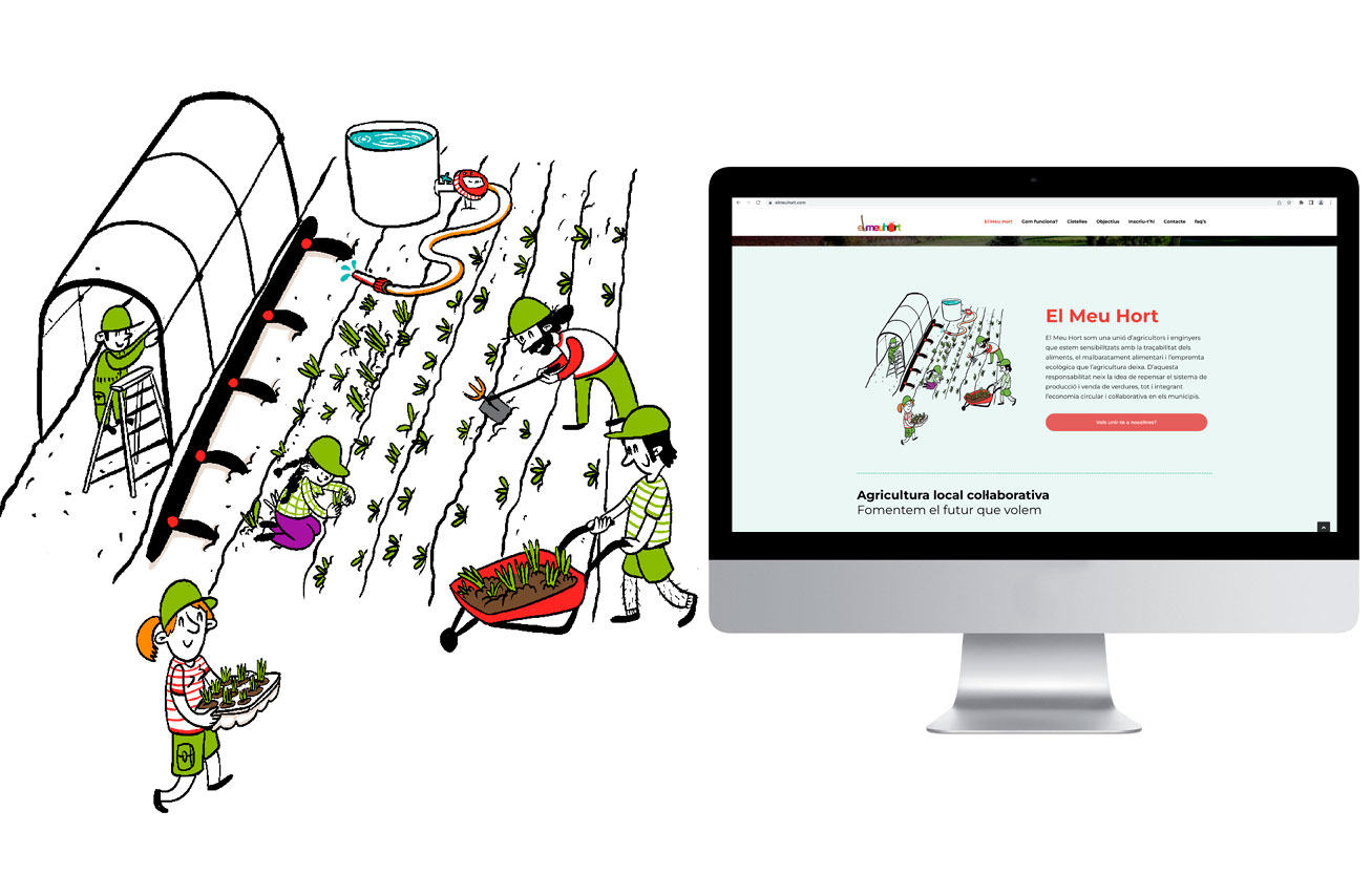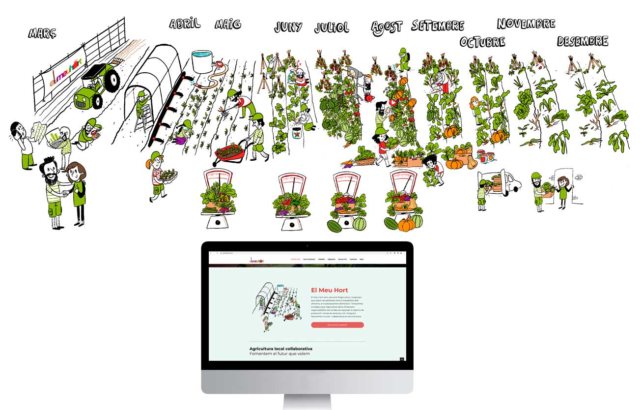 Ilustraciones para el proyecto de huerta por suscripción de El meu hort. Se trata de un proyecto que replantea al sistema de producción y venta de verduras integrando la economía circular y colaborativa.