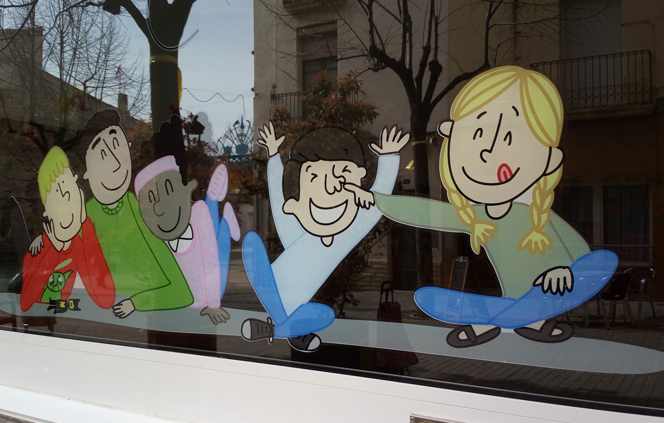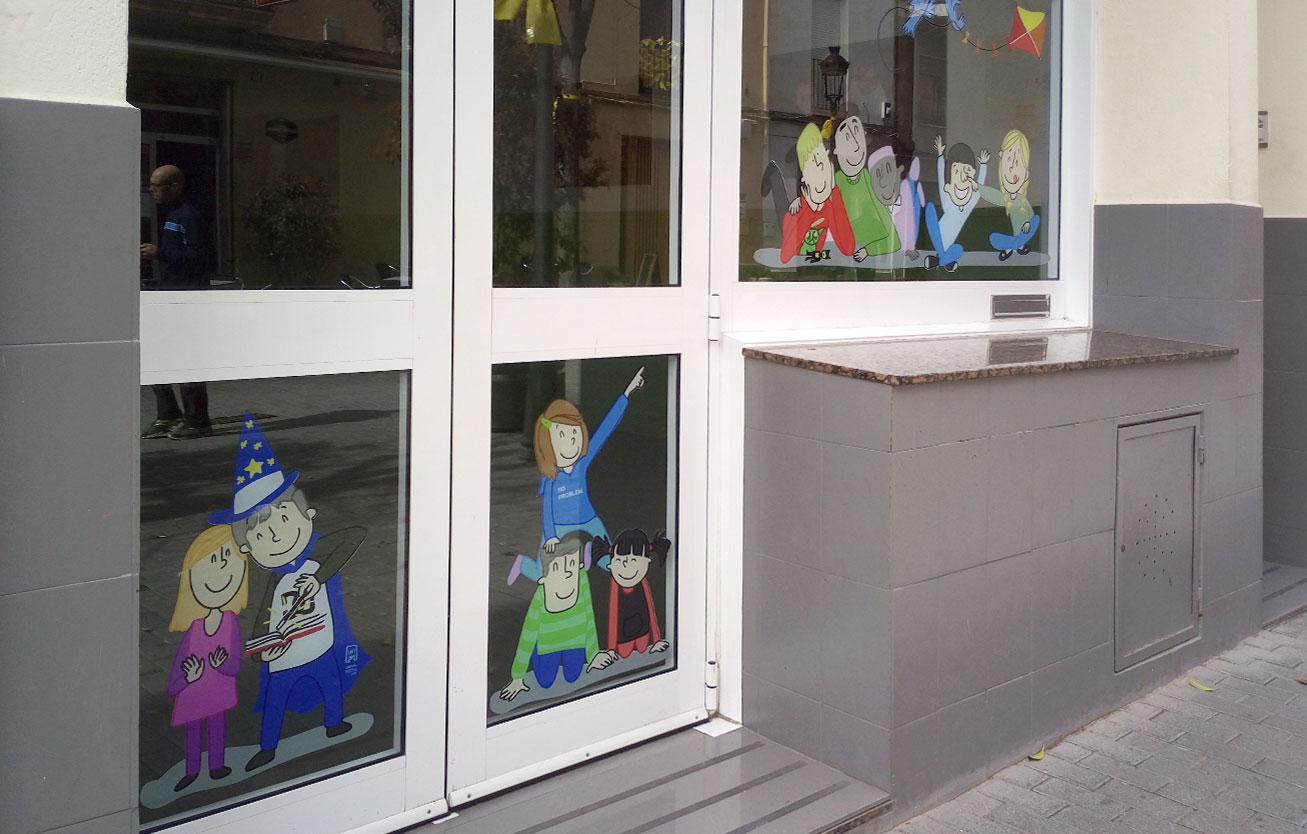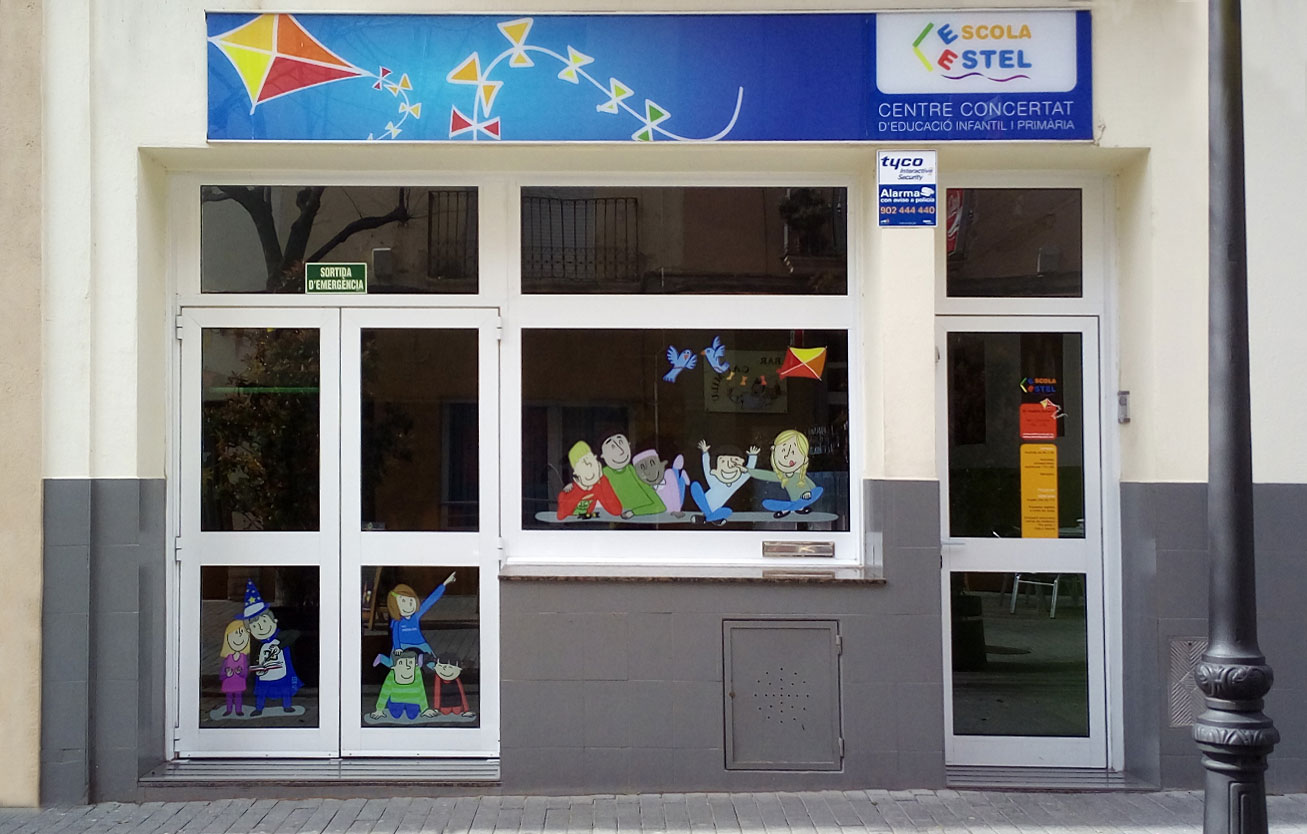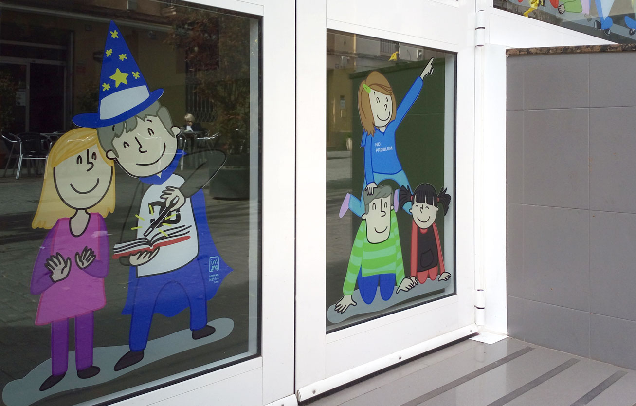 Ilustraciones en vinilo para decorar la puerta principal del colegio Estel de Esparreguera.