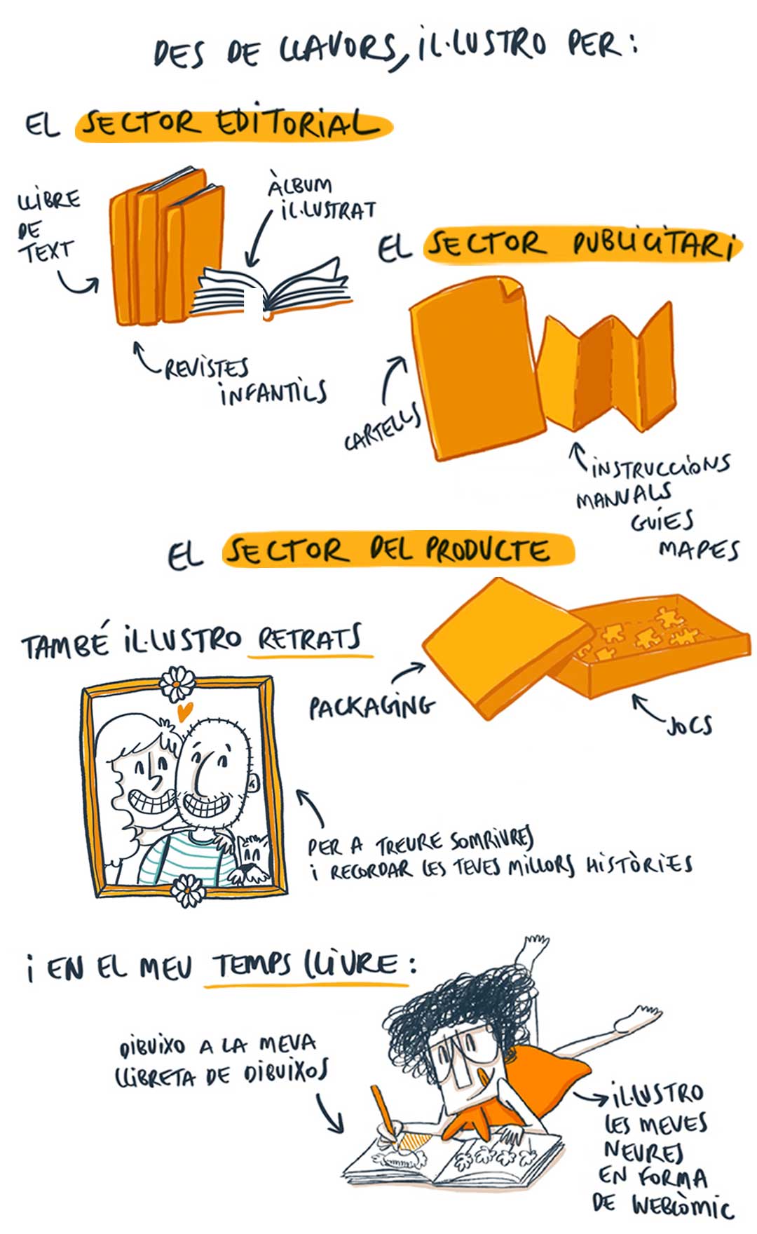Il·lustro pel sector editorial, publicitari i de producte. Per això, en el meu portfoli trobaràs il·lustracions per a àlbums il·lustrats, llibres de text, cartells, manuals i guies, jocs infantils i packaging.